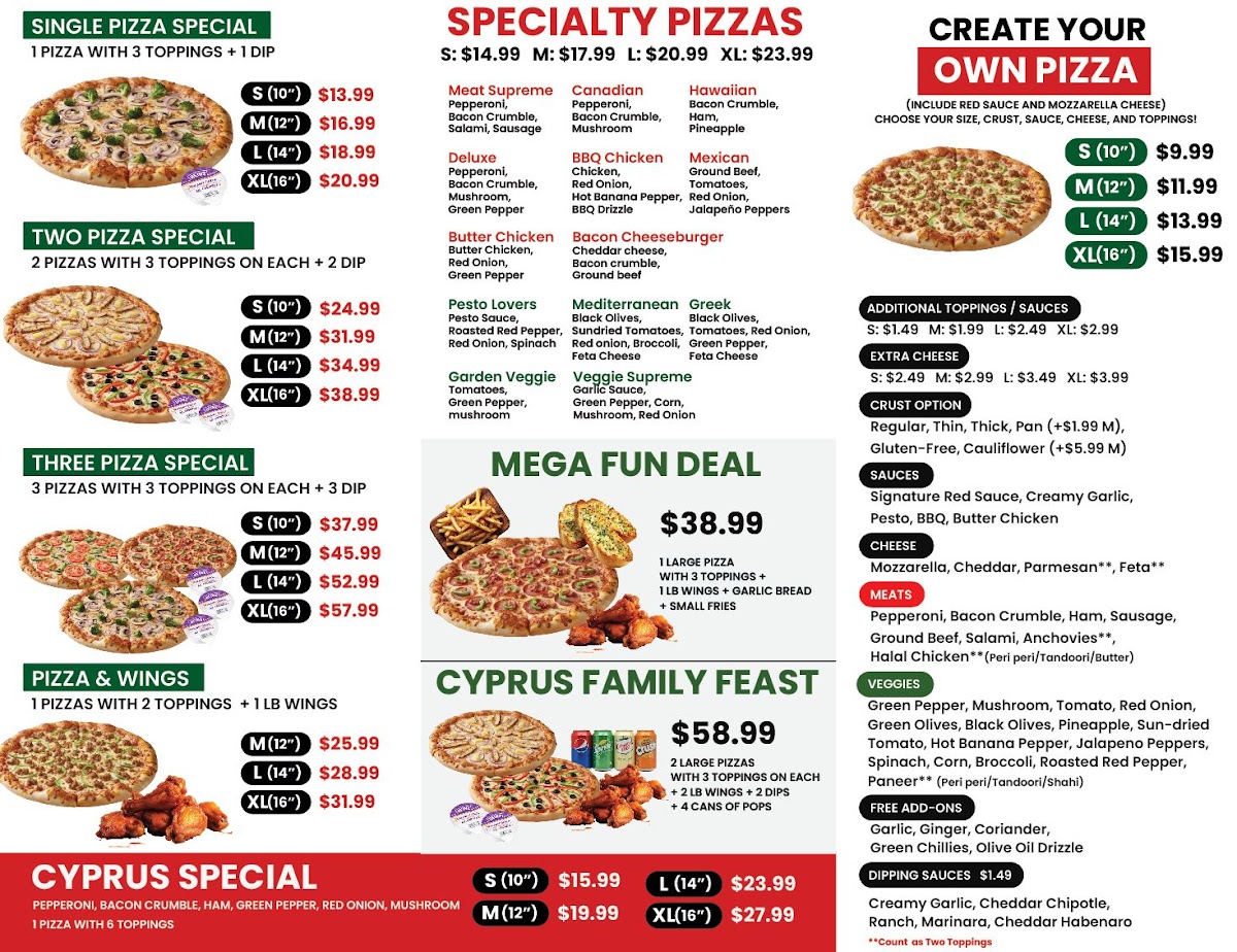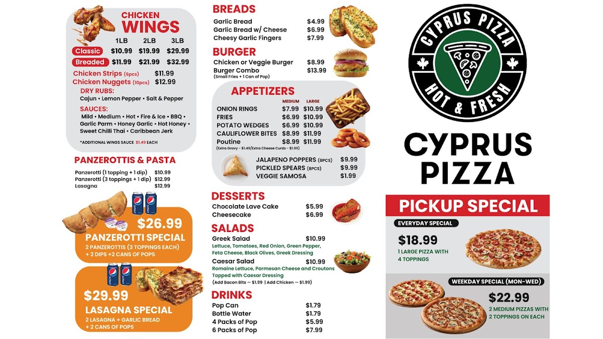 The menu at Cyprus Pizza offers a straightforward, comforting selection that suits casual meals and easygoing moments. Here, you'll find classic pizza options alongside familiar sides and simple drinks, perfect for a relaxed lunch, a quick dinner, or a shared snack with friends and family.